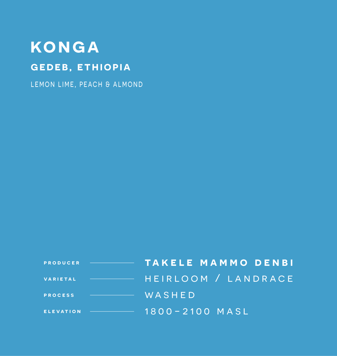 Takele Mammo Denbi farms this lot on his 8 Hectare farm in the Konga District, part of the renowned Gedeo Zone, famous for Yirgacheffe coffee. The conga cooperative is known for its high quality beans, and its a pleasure to highlight farmers like Takele, who are committed to improving coffee quality and improving opportunities for fellow farmers.
